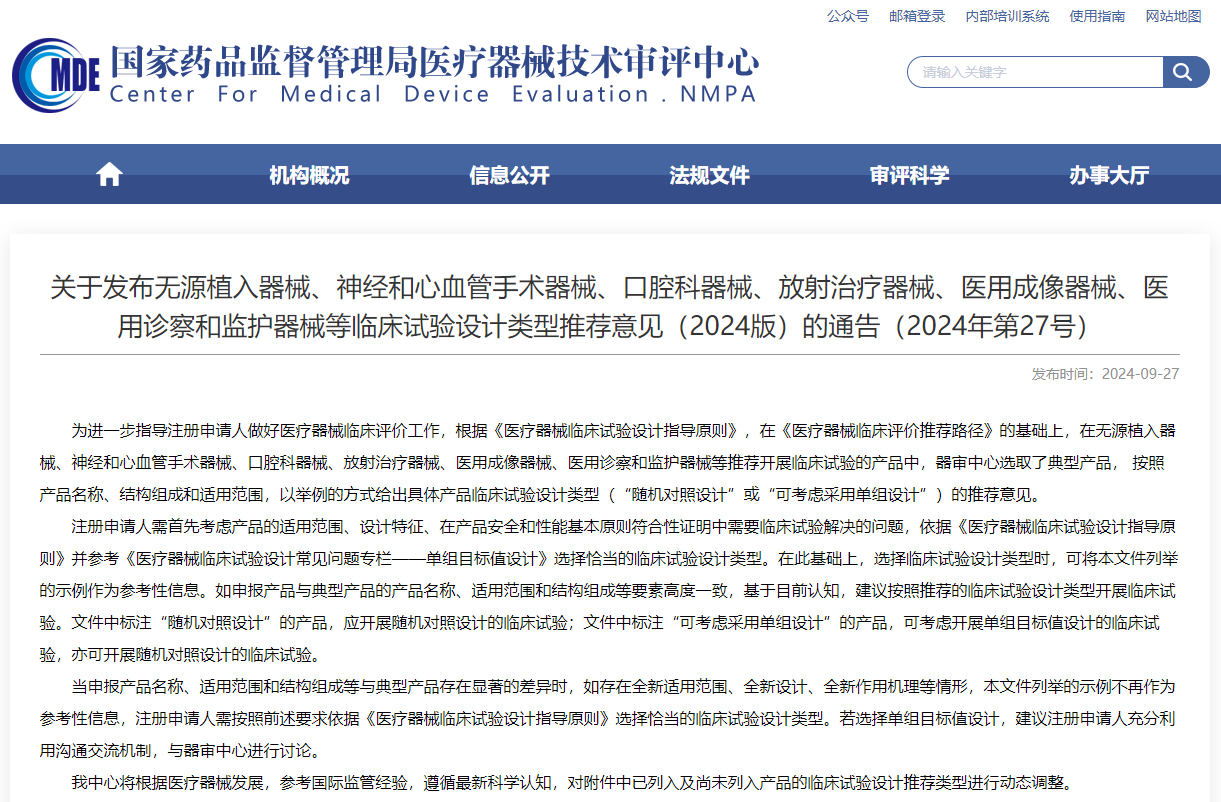 無源植入器械、神經(jīng)和心血管手術器械、口腔科器械、放射治療器械、醫(yī)用成像器械、醫(yī)用診察和監(jiān)護器械等臨床試驗設計類型推薦意見近日,器審中心發(fā)布《無源植入器械、神經(jīng)和心血管手術器械、口腔科器械、放射治療器械、醫(yī)用成像器械、醫(yī)用診察和監(jiān)護器械等臨床試驗設計類型推薦意見(2024版)的通告》。
