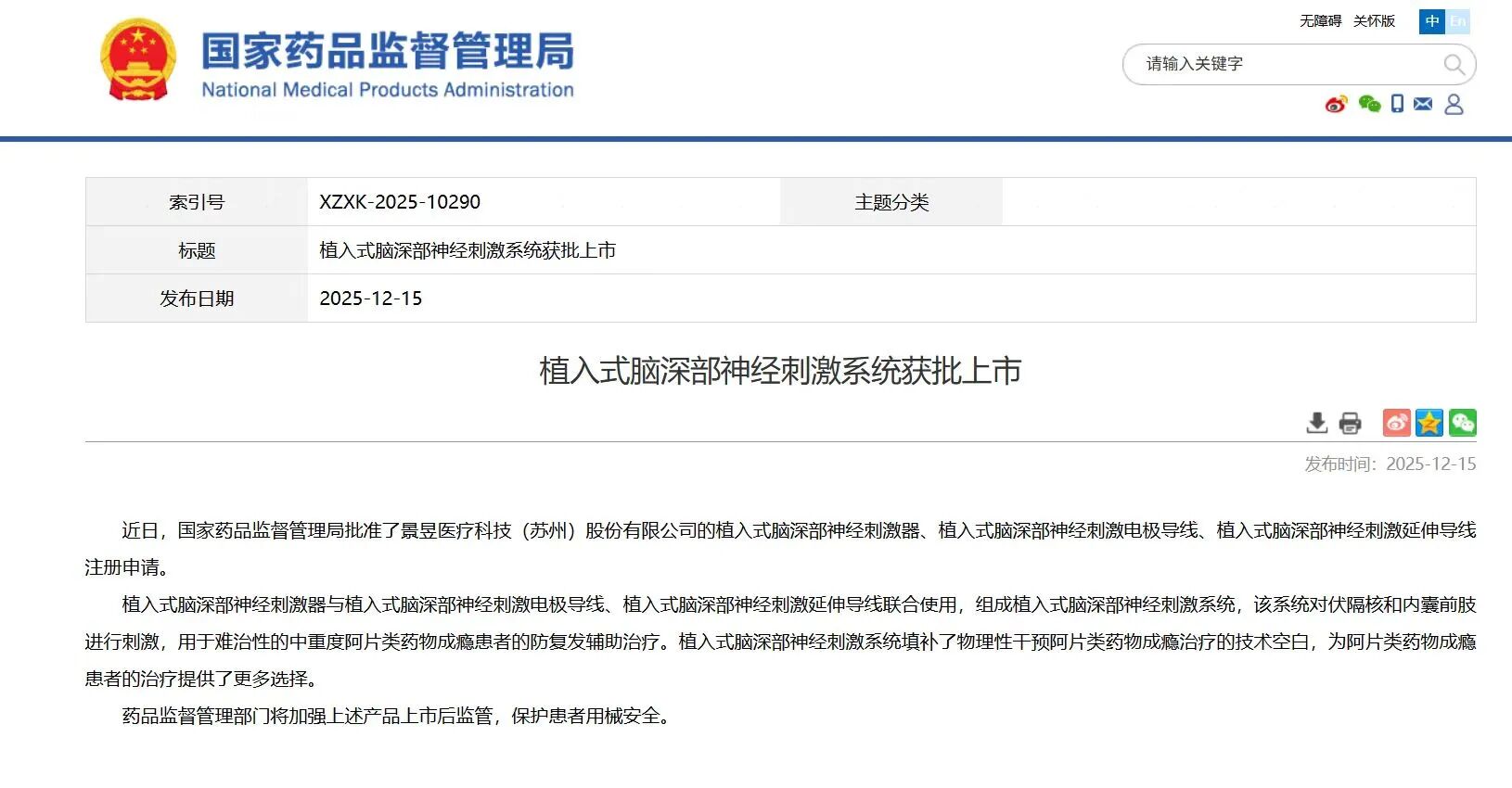 2025年12月15日,經(jīng)國家藥品監(jiān)督管理局公示,景昱醫(yī)療科技(蘇州)股份有限公司的植入式腦深部神經(jīng)刺激器(國械注準(zhǔn)20253122580)及植入式腦深部神經(jīng)刺激延伸導(dǎo)線產(chǎn)品獲得NMPA批準(zhǔn)上市,奧泰康提供MA解決方案。