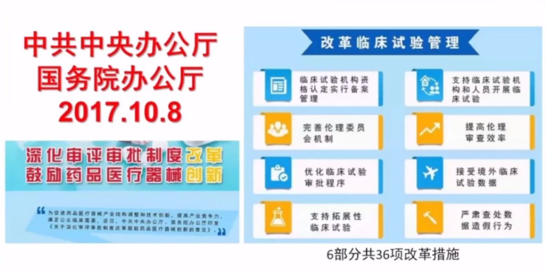 2017年10月8日,為鼓勵藥品醫(yī)療器械科技創(chuàng)新,提高上市產(chǎn)品質(zhì)量和產(chǎn)業(yè)競爭力,滿足公眾臨床需要,中共中央辦公廳、國務(wù)院辦公廳印發(fā)了《關(guān)于深化審評審批制度改革鼓勵藥品醫(yī)療器械創(chuàng)新的意見》。在多方面深化了審批制度,包括改革臨床試驗(yàn)管理、加快上市審評審批、促進(jìn)藥品創(chuàng)新和仿制藥發(fā)展、加強(qiáng)藥品醫(yī)療器械全生命周期管理、提升技術(shù)支撐能力、加強(qiáng)組織實(shí)施等。
