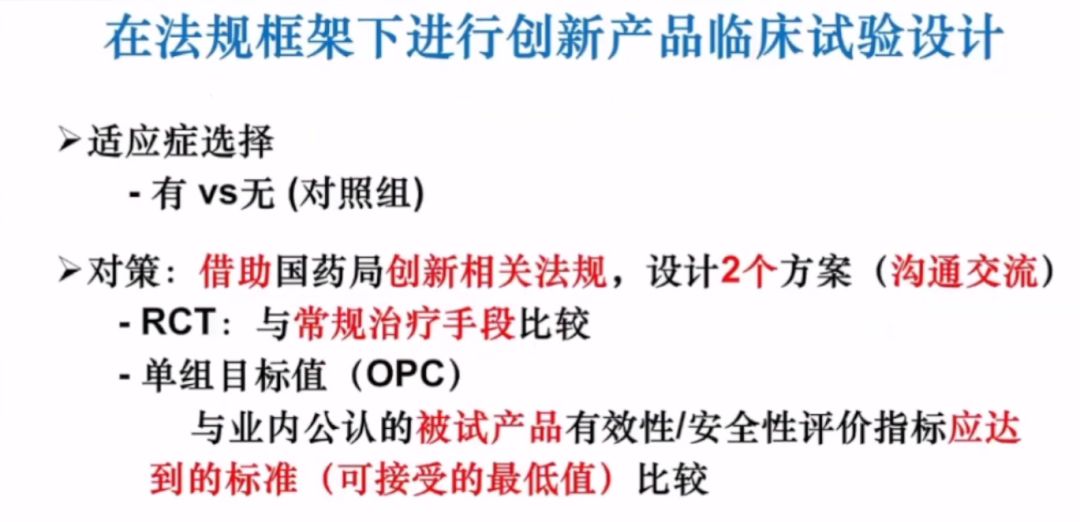 在法規(guī)框架下進(jìn)行創(chuàng)新產(chǎn)品的臨床試驗(yàn)設(shè)計(jì),李教授認(rèn)為最關(guān)鍵的是適應(yīng)癥的選擇問題(有無對照組),可設(shè)計(jì)出2個(gè)方案,以便和國家藥監(jiān)局相關(guān)部門溝通。