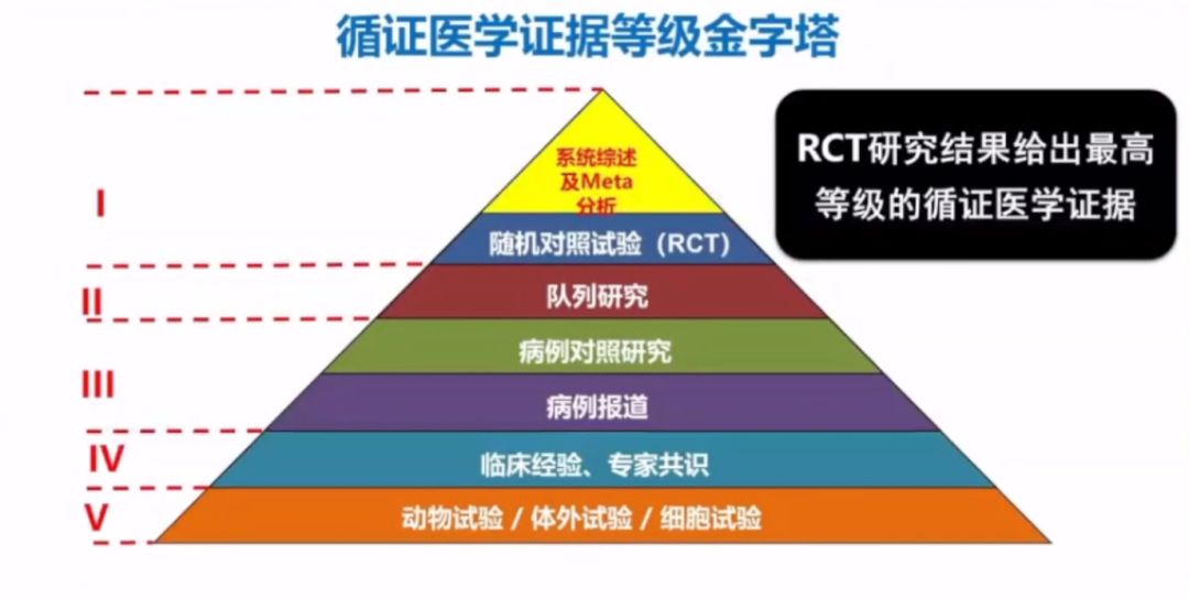 李衛(wèi)教授表示,根據(jù)循證醫(yī)學(xué)證據(jù)級別金字塔中最高等級的I級證據(jù)顯示,基于良好設(shè)計(jì)的隨機(jī)對照試驗(yàn)(randomized controlled trial,RCT)最能夠評價(jià)器械的安全性和有效性。