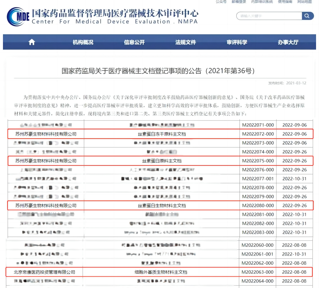 8月,CDMO中心四款醫(yī)療器械原材料通過(guò)主文檔登記備案(絲素蛋白凍干原料、絲素蛋白原料、絲素蛋白生物材料、細(xì)胞外基質(zhì)生物材料),主文檔備案的通過(guò)為醫(yī)藥行業(yè)細(xì)胞外基質(zhì)和絲素蛋白產(chǎn)品研發(fā)及生產(chǎn)提供了合法來(lái)源的原料,具有里程碑意義。