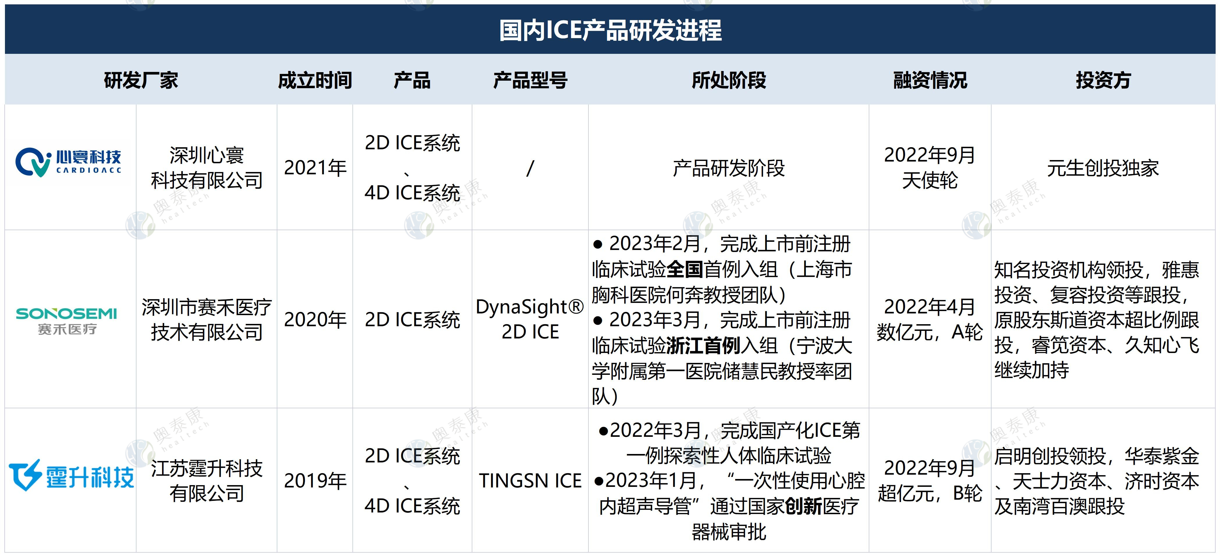 全球ICE市場(chǎng)中,歐美企業(yè)占主要份額,強(qiáng)生、雅培、西門子、飛利浦、GE醫(yī)療、波士頓科學(xué)等均已布局,而國(guó)內(nèi)ICE起步較晚,仍處發(fā)展初期,相關(guān)產(chǎn)品和市場(chǎng)滲透率較低,企業(yè)具有較大的發(fā)展空間,國(guó)內(nèi)研發(fā)廠商有塞禾醫(yī)療、心寰科技、霆升科技、澤樸醫(yī)療、歡影醫(yī)療等。隨著ICE在臨床應(yīng)用優(yōu)勢(shì)的凸顯,ICE賽道逐漸升溫并獲得資本青睞,國(guó)內(nèi)部分ICE廠家已在2022年完成新一輪融資。