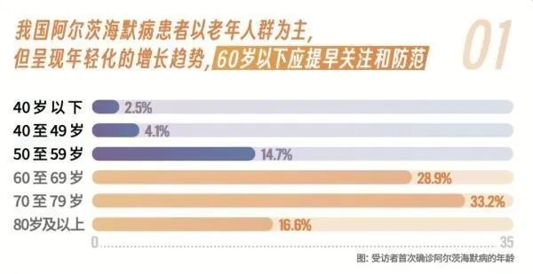 數(shù)據(jù)表明,首次確診阿爾茨海默病的人群中,年齡在60至79歲之間的人群占比最高,為62.1%。但值得注意的是,60歲以下的阿爾茨海默病發(fā)病患者在本次調(diào)查中占到了21.3%,相比國(guó)際上報(bào)道的早發(fā)型阿爾茨海默病占比5-10%更多,表明阿爾茨海默病在我國(guó)發(fā)病越來(lái)越年輕化。由于這類罹患人群尚處工作年齡,需要引起全社會(huì)的高度重視,強(qiáng)化全人群健康教育,加強(qiáng)疾病預(yù)防、早期篩查和診斷。
