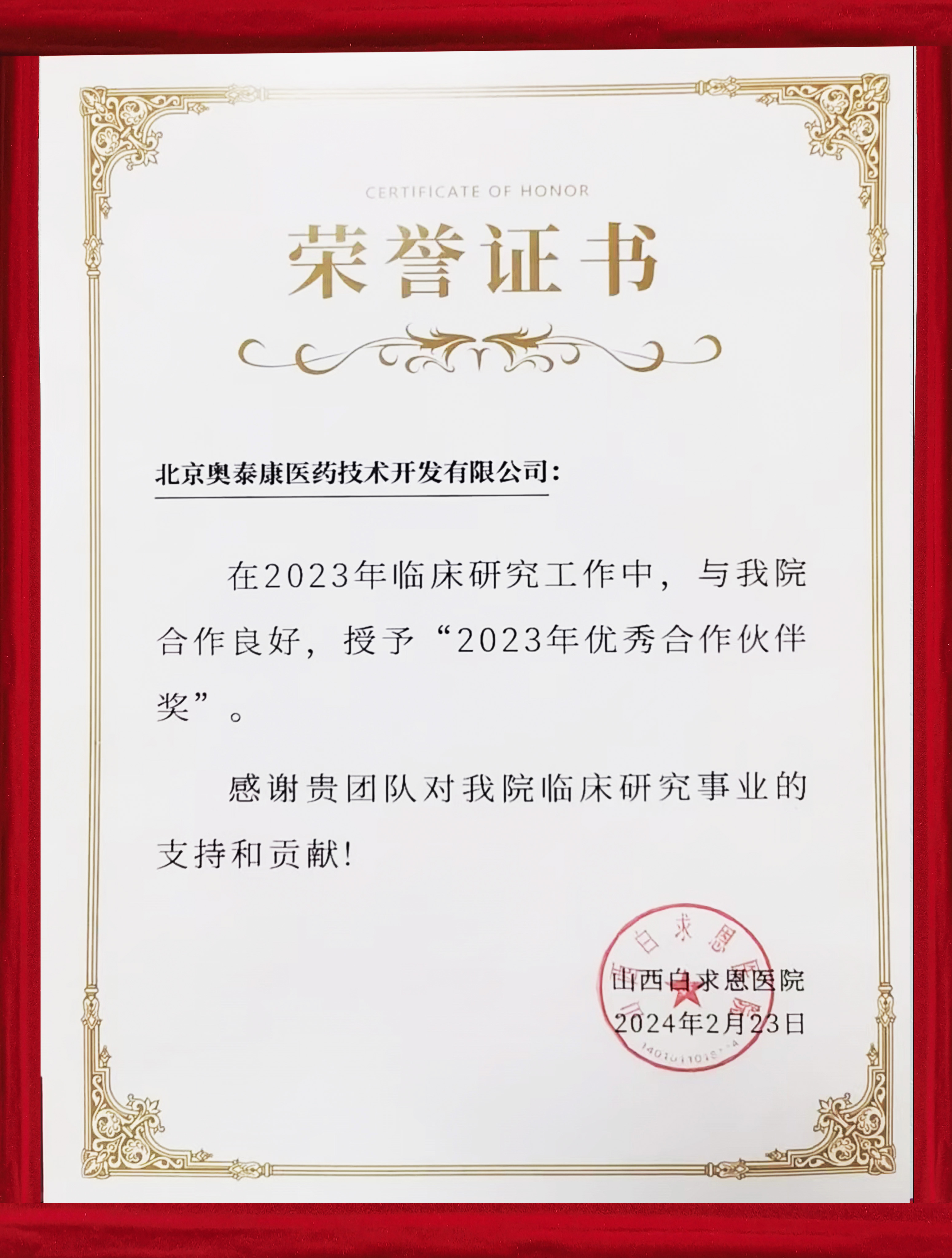 喜報~奧泰康榮獲山西白求恩醫(yī)院 同濟山西醫(yī)院“2023年優(yōu)秀合作伙伴獎”攜手前行,推進臨床研究事業(yè)高質(zhì)量發(fā)展???前言